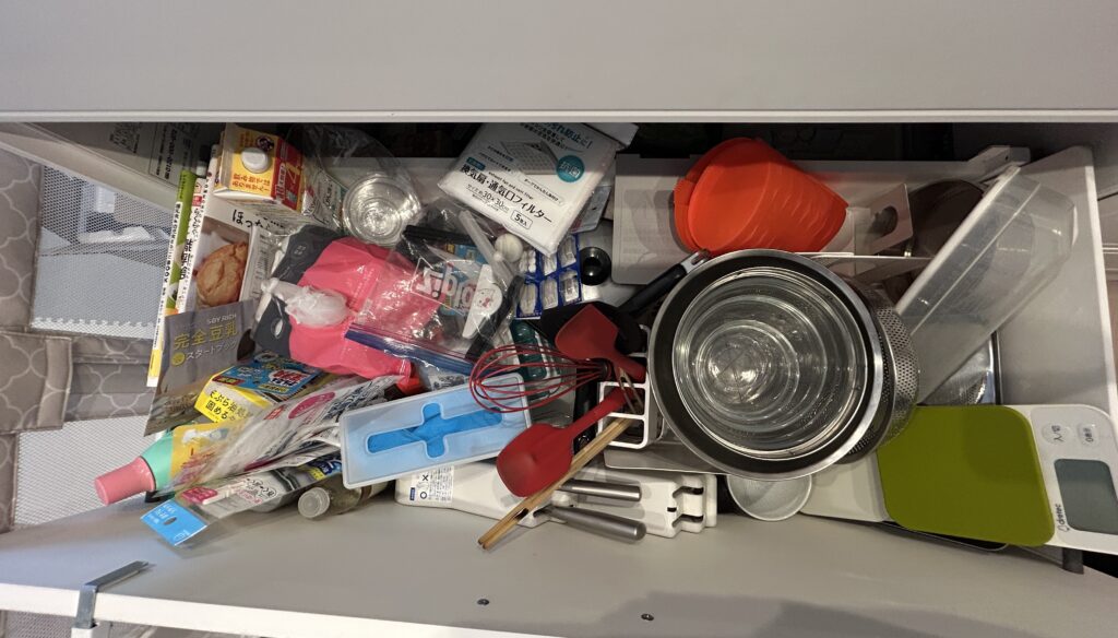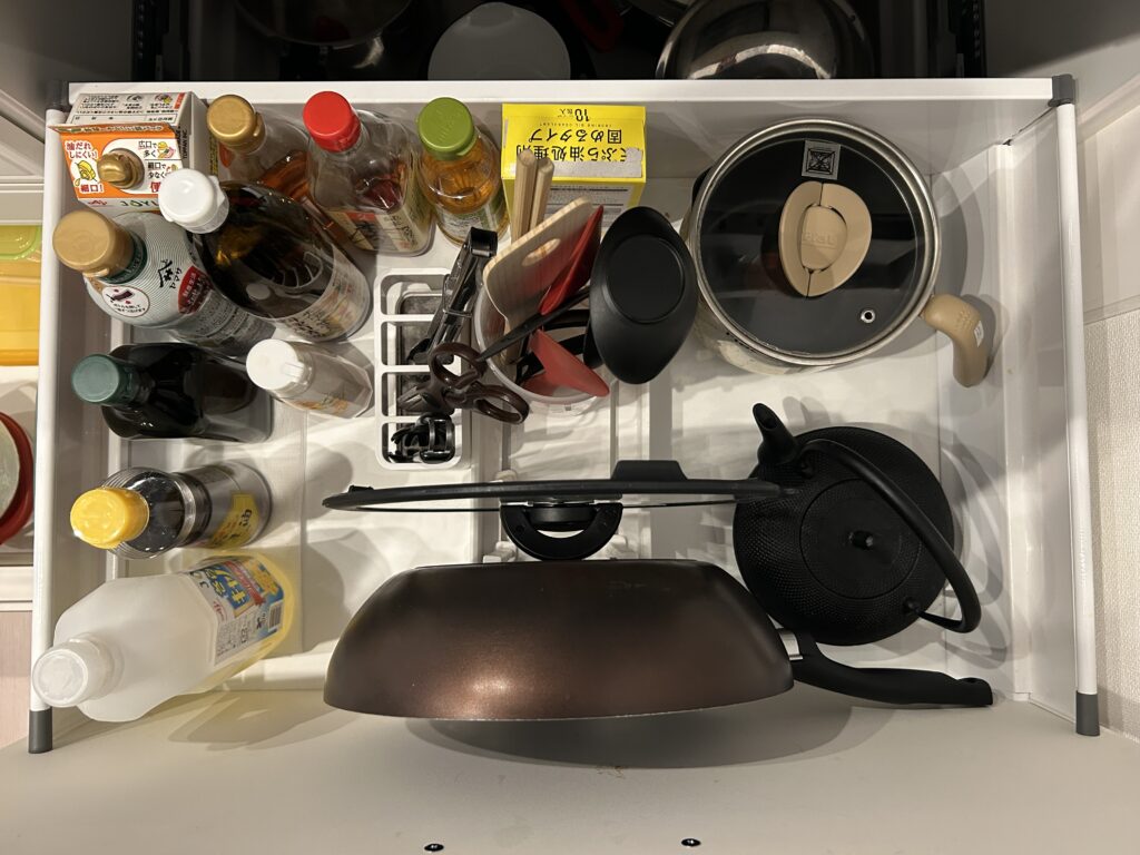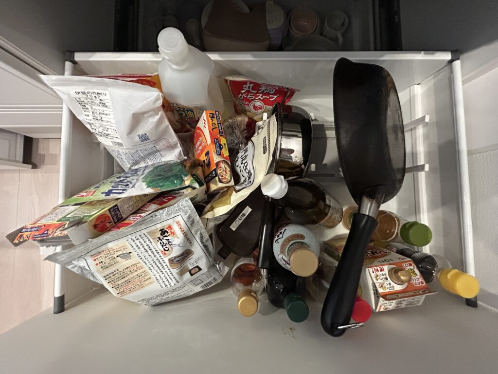 コンロ下引出し 鍋類と調味料と食材が混在して
