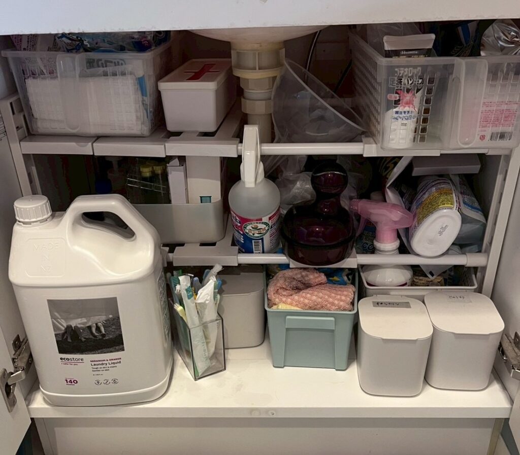 【洗面台下】棚を入れてスペースを有効活用しているけど、モノの高さと棚間が合わず使いにくそう